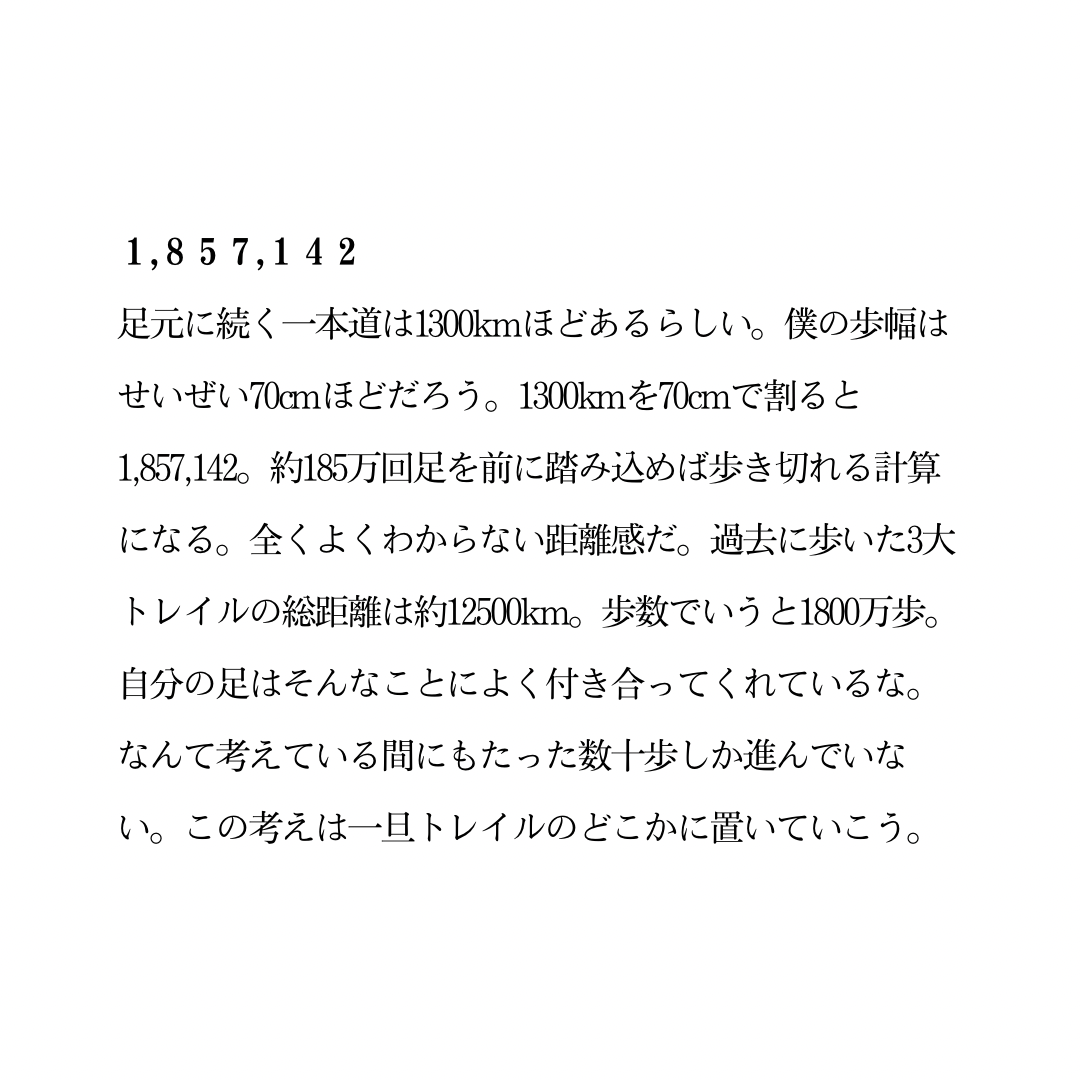 足元に続く一本道は1300kmほどあるらしい。僕の歩幅はせいぜい70cmほどだろう。1300kmを70cmで割ると1,857,142。約185万回足を前に踏み込めば歩き切れる計算になる。全くよくわからない距離感だ。過去に歩いた3大トレイルの総距離は約12500km。歩数でいうと1800万歩。自分の足はそんなことによく付き合ってくれているな。なんて考えている間にもたった数十歩しか進んでいない。この考えは一旦トレイルのどこかに置いていこう。